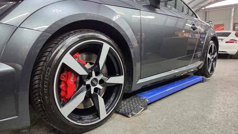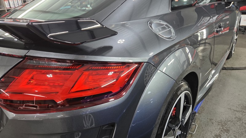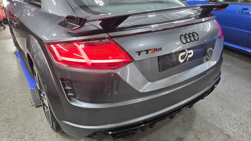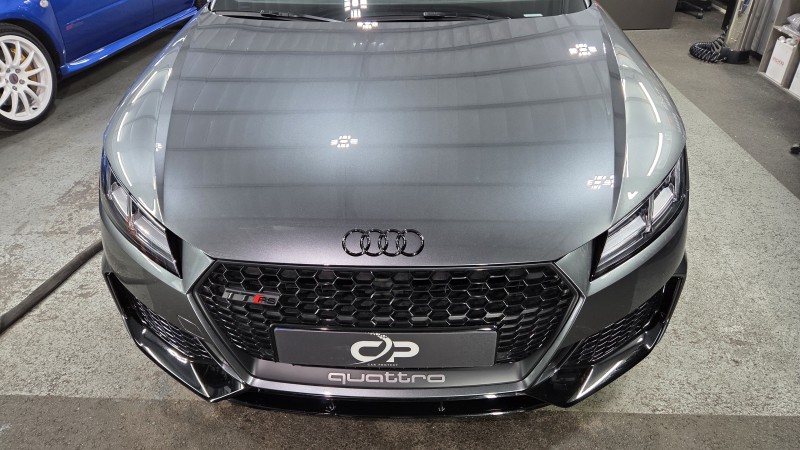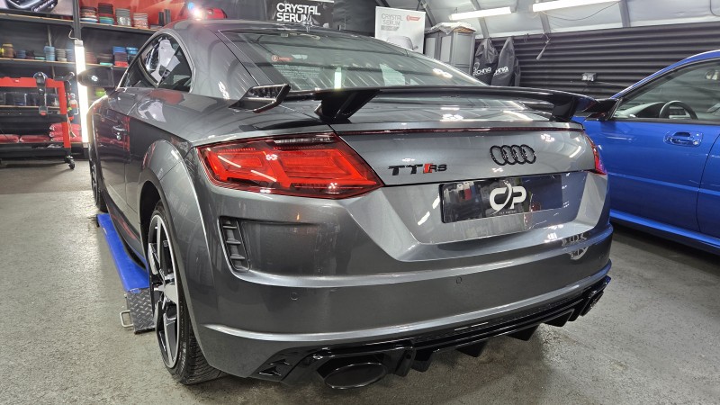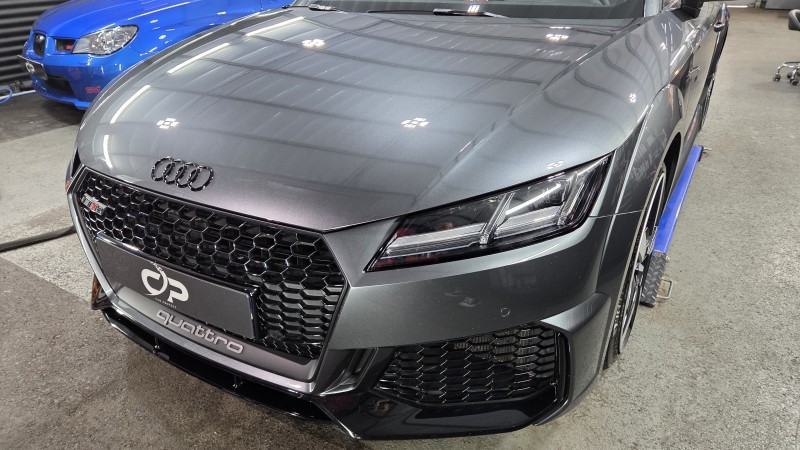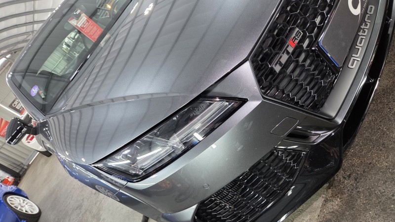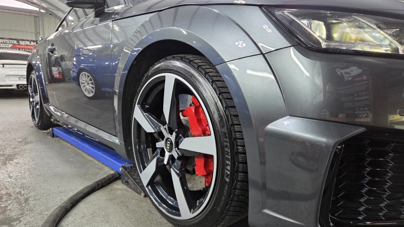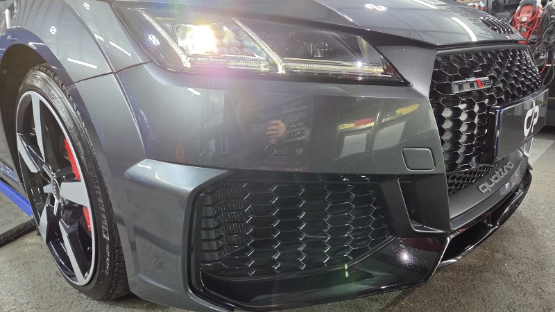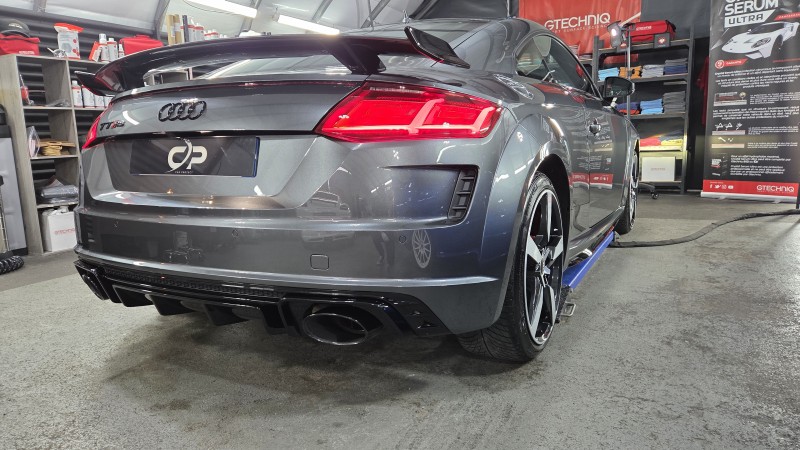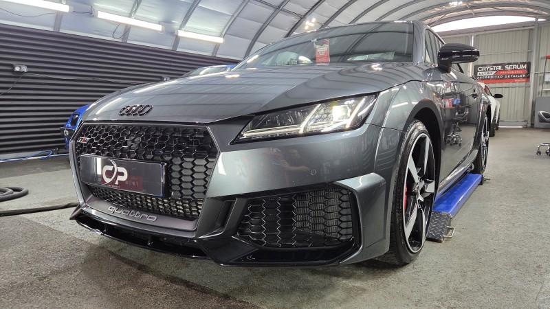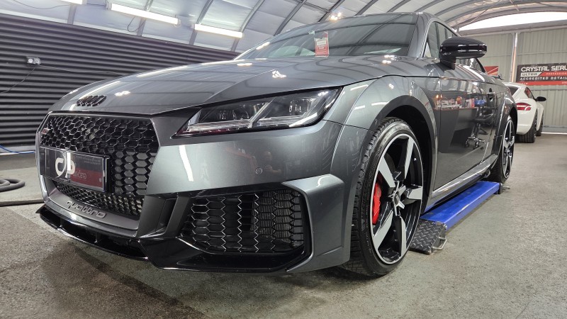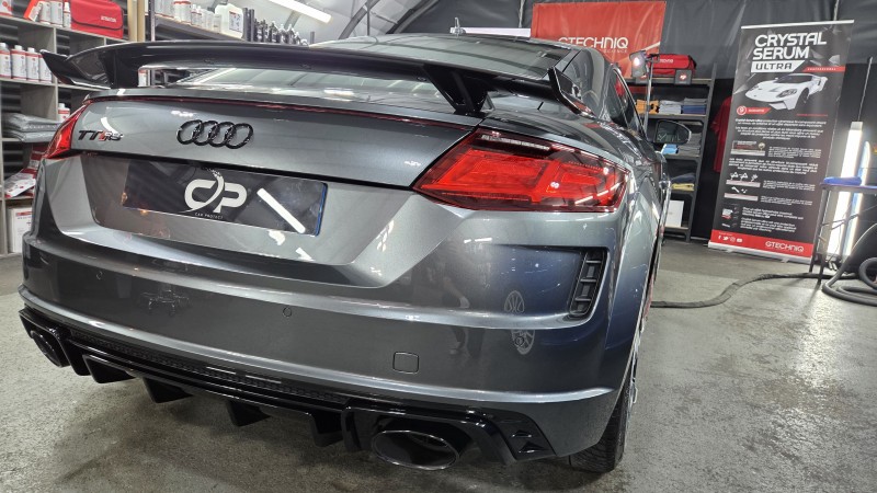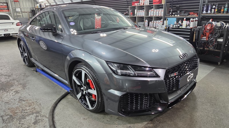 Cette Audi TT RS, sportive compacte et radicale, a été sublimée dans notre atelier grâce à un polissage intensif de correction et à l’application de la protection céramique Gtechniq Crystal Serum Ultra 10H, certifiée ISO 15184 et garantie 9 ans.