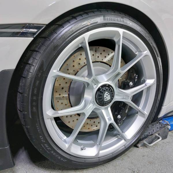Pour que l'ensemble soit complet et que le lavage soit des plus faciles, nous avons posé la céramique Gtechniq C5 sur les jantes et les étriers, et la céramique C4 sur les parties en plastique y compris les zones sous l'aileron rétractable.