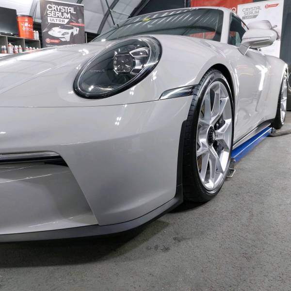 Le meilleur choix possible pour protéger cette superbe Porsche GT3 Touring: une céramique Gtechniq Crystal Sérum Ultra 10h certifiée ISO 15184 et garantie 9 ans associé à une protection PPF Xpel sur la face avant (pare-choc, capot, ailes et rétros). Le film est protégé avec la céramique Halo de Gtechniq, céramique "flexible" spécifiquement étudiée pour les films PPF.
